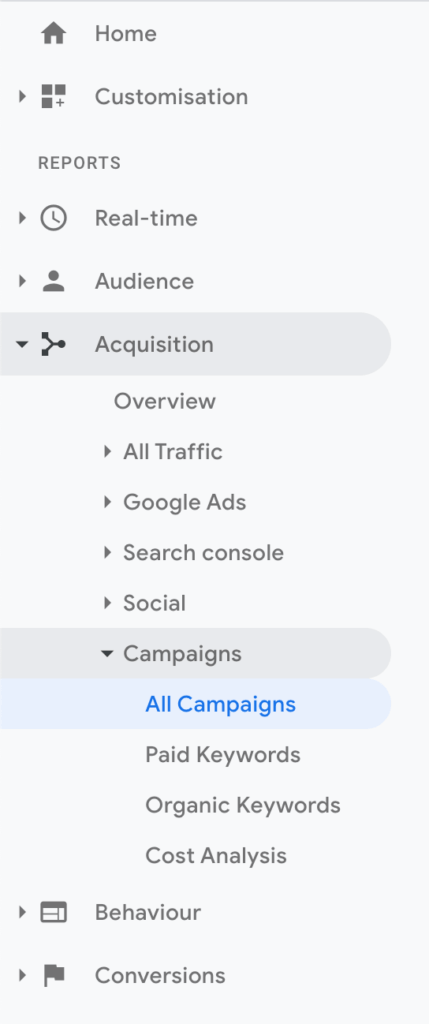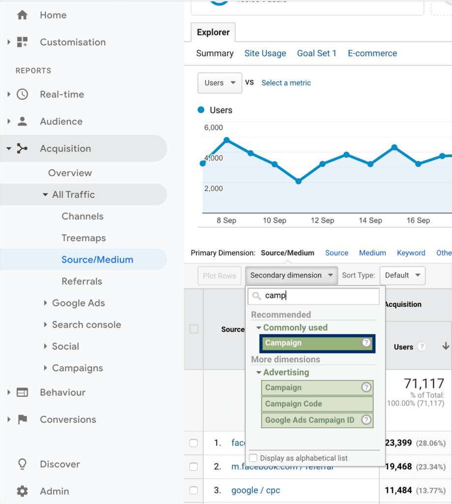 W tym widoku, musisz ustawić jeszcze dodatkowy wymiar „secondary dimension” i wybrać w nim opcję: „campaign”.