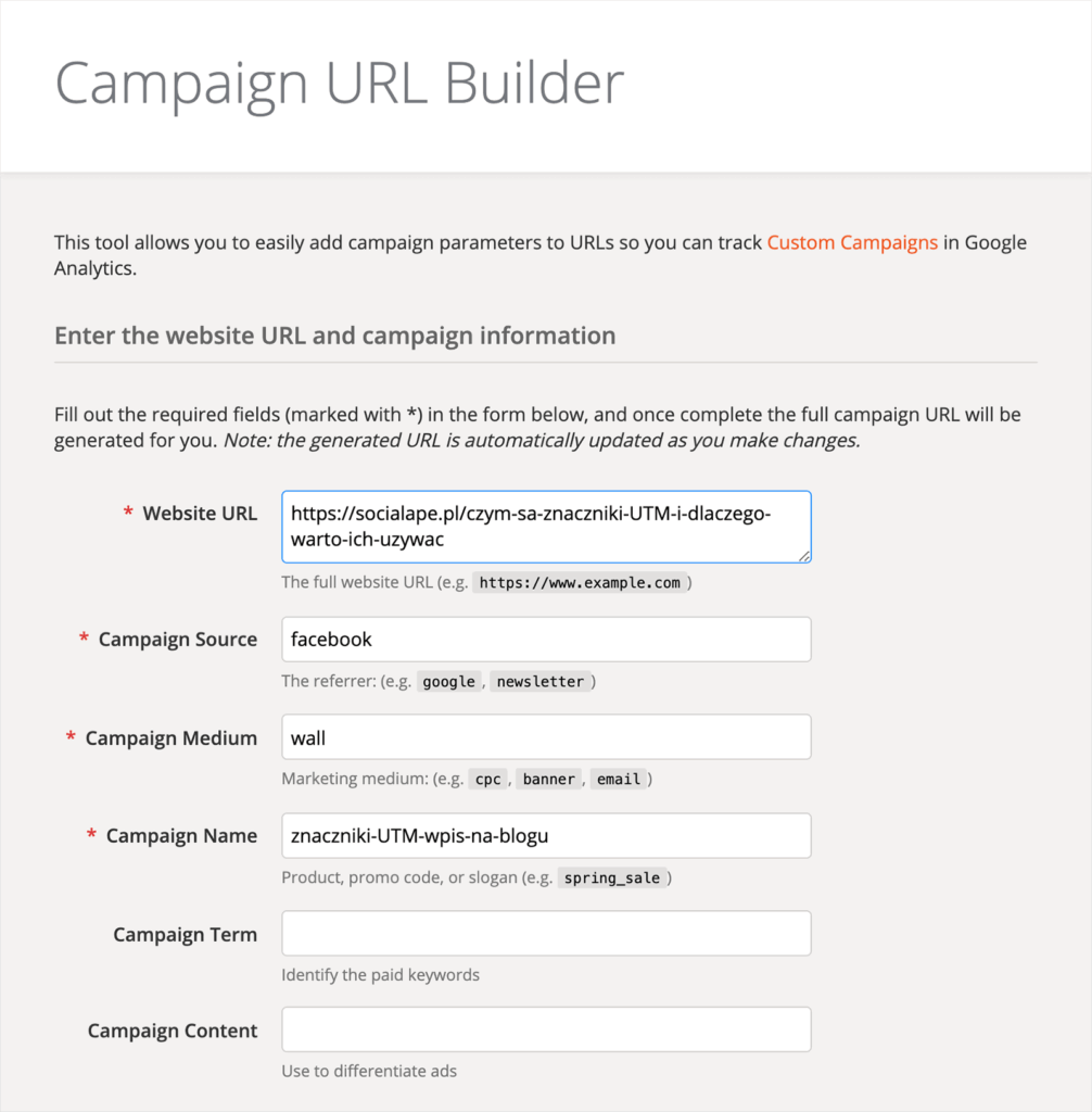 https://www.socialape.pl/czym-sa-znaczniki-UTM-i-dlaczego-warto-ich-używac/?utm_source=facebook&utm_medium=wall&utm_campaign=znaczniki-UTM-wpis-na-blogu