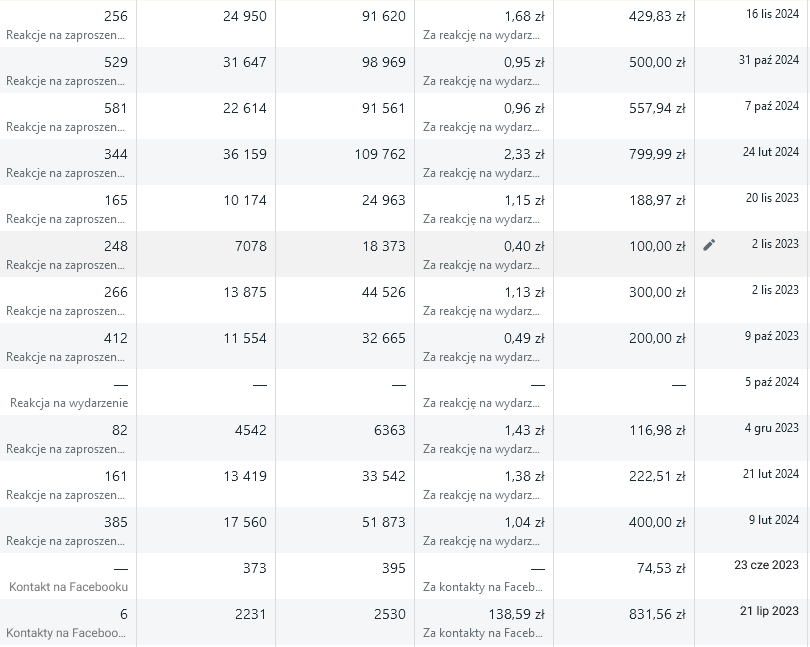 Przykładowe statystyki kampanii Facebook Ads.