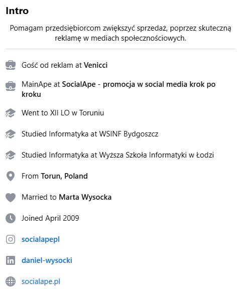- wezwanie do działania (CTA) – np. „Zobacz moje ostatnie posty” albo „Napisz do mnie, jeśli chcesz porozmawiać”.